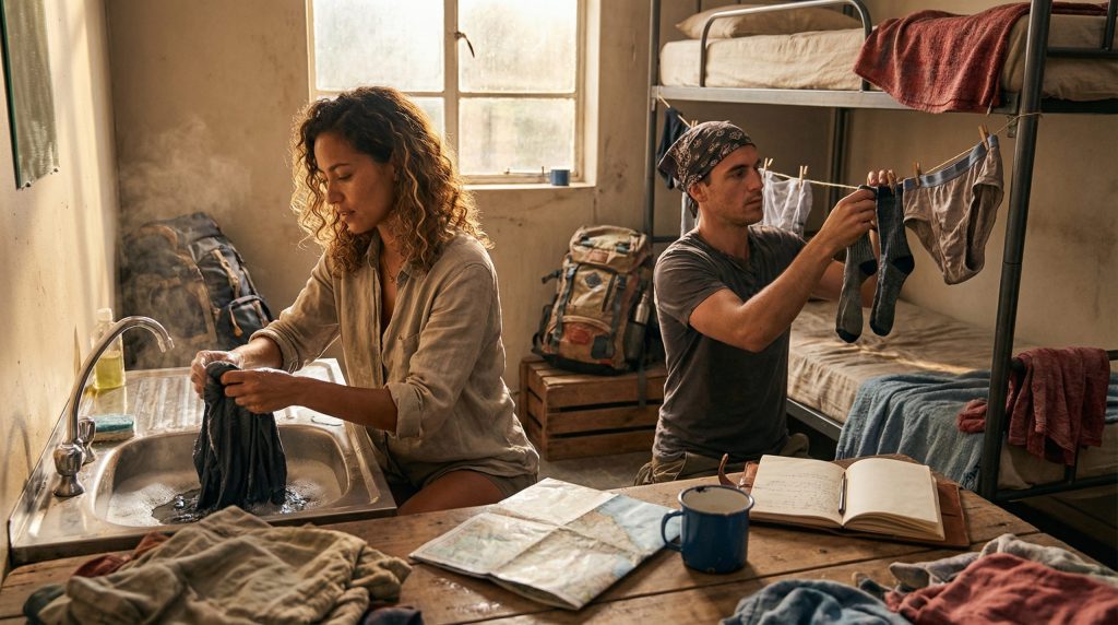 A lavanderia é, talvez, a tarefa menos glamourosa e mais constante. Em viagens longas, você raramente terá acesso a máquinas de lavar. O processo manual torna-se um ritual:
